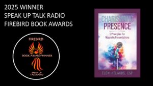 A graduate in both Theatre Arts and Semiotics from Brown University, Eleni is a past president of the Michigan chapter of the National Speakers Association. She is the author of two books, Touch the Sky: Find Your Voice, Speak Your Truth, Make Your Mark (which was a gold medal winner of the 2014 Global e-Book Awards) and the 2021 #1 Amazon Bestseller/#1 Amazon Best New Release, Claim the Stage! A Woman’s Guide to Speaking Up, Standing Out, and Taking Leadership. Her third book, Charismatic Presence: Five Principles for Magnetic Presentations, released in 2025, is an Amazon #1 bestseller and has won a Firebird book award and an award from Literary Titan